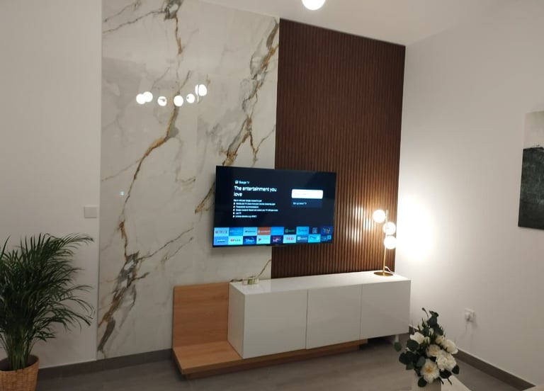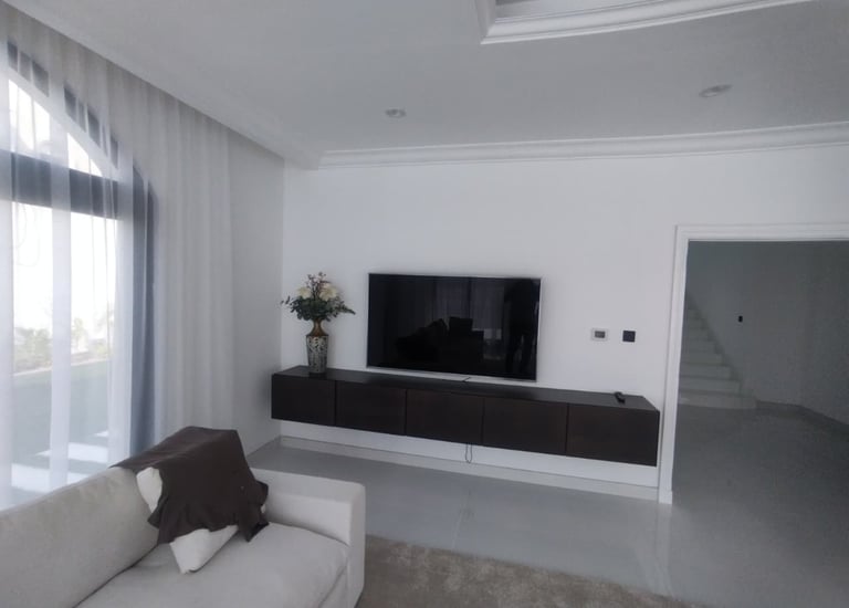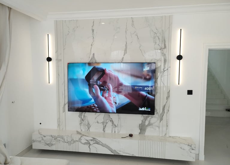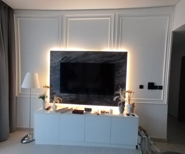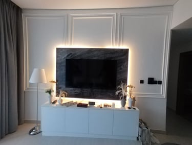 TV unit installation customized as per the client’s choice, featuring a two-tone bench with different colors for the top and bottom. The design included concealed wiring, elegant marble cladding, and a half-floating panel for a modern and stylish finish